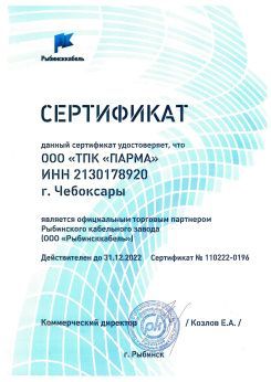 Данный сертификат удостоверяет, что ООО "ТПК ПАРМА" является официальным торговым партнером Рыбинского кабельного завода ООО "Рыбинсккабель"