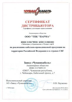 Сертификат Дистрибьютора удостоверяет права компании ООО "ТПК ПАРМА" на реализацию кабельно-проводниковой продукции на территории Российской Федерации и в странах СНГ.